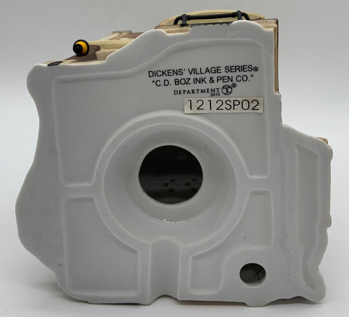Released in 2013. Dickens' Village "DC Boz Ink & Pen Co." is part of the Bond Street Shoppes subseries. C.D. represents Charles Dickens. Item #4030359. Retired in 2014. Item is "used".