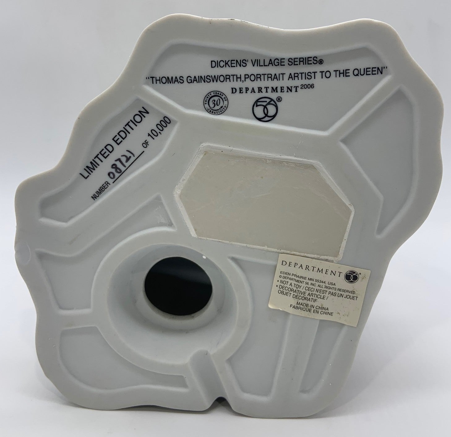 Released in 2006. Meet Thomas Gainsworth, the distinguished portrait artist who captured the likenesses of Victorian nobility. Hand numbered, limited edition of 10,000 pieces. This charming Department 56 Dickens' Village building brings authentic period character to your village collection. Item # 58747. Retired in 2006. See photos for item and box condition. Item is "used". Includes sign (not pictured)