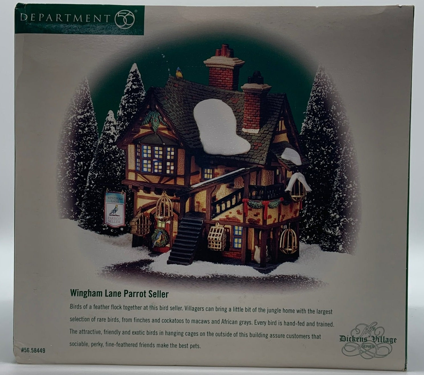 Released in 1999. Dickens' Village "Wingham Lane Parrot Seller" is intricately designed bird store. Item #58449. Retired in 2001. See photos for box and item condition. Item is "used".