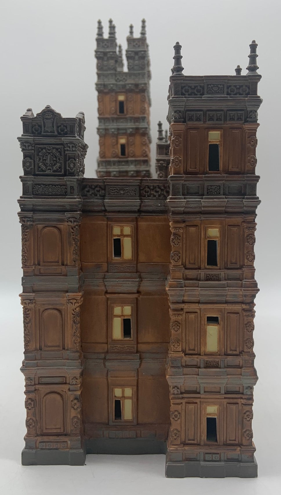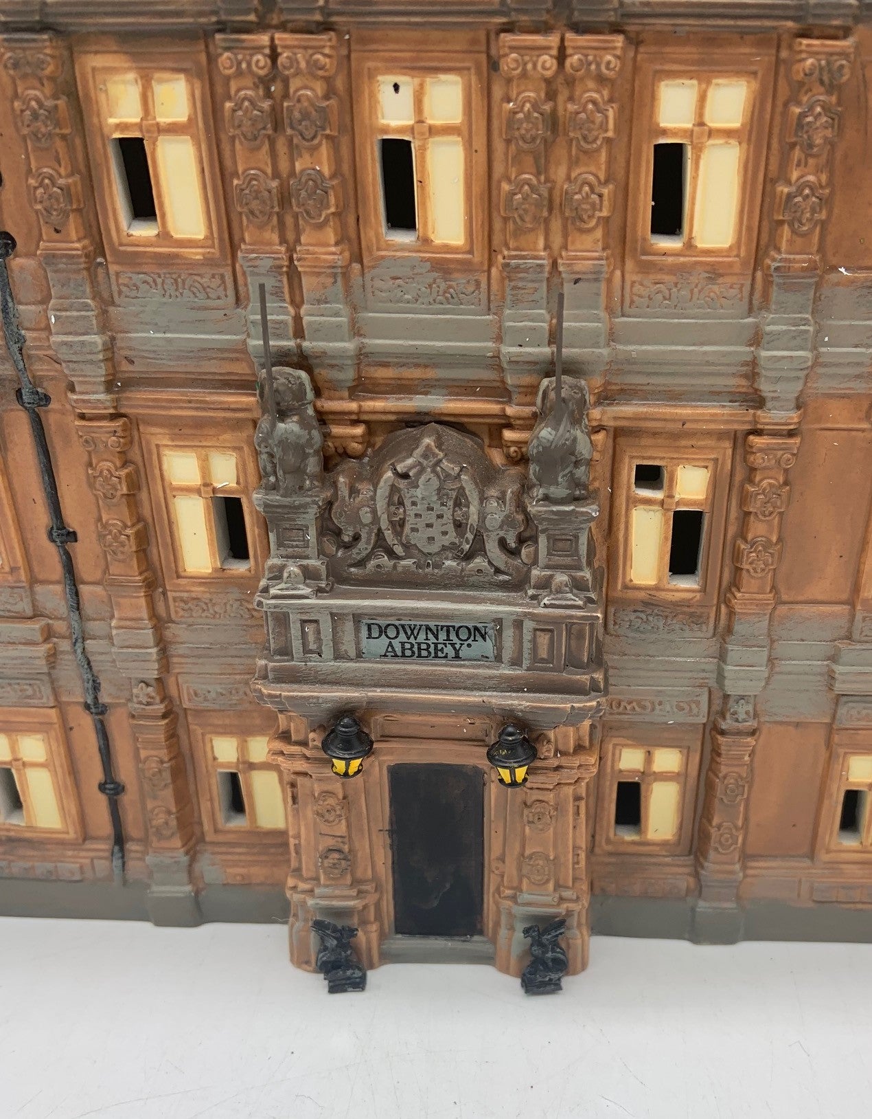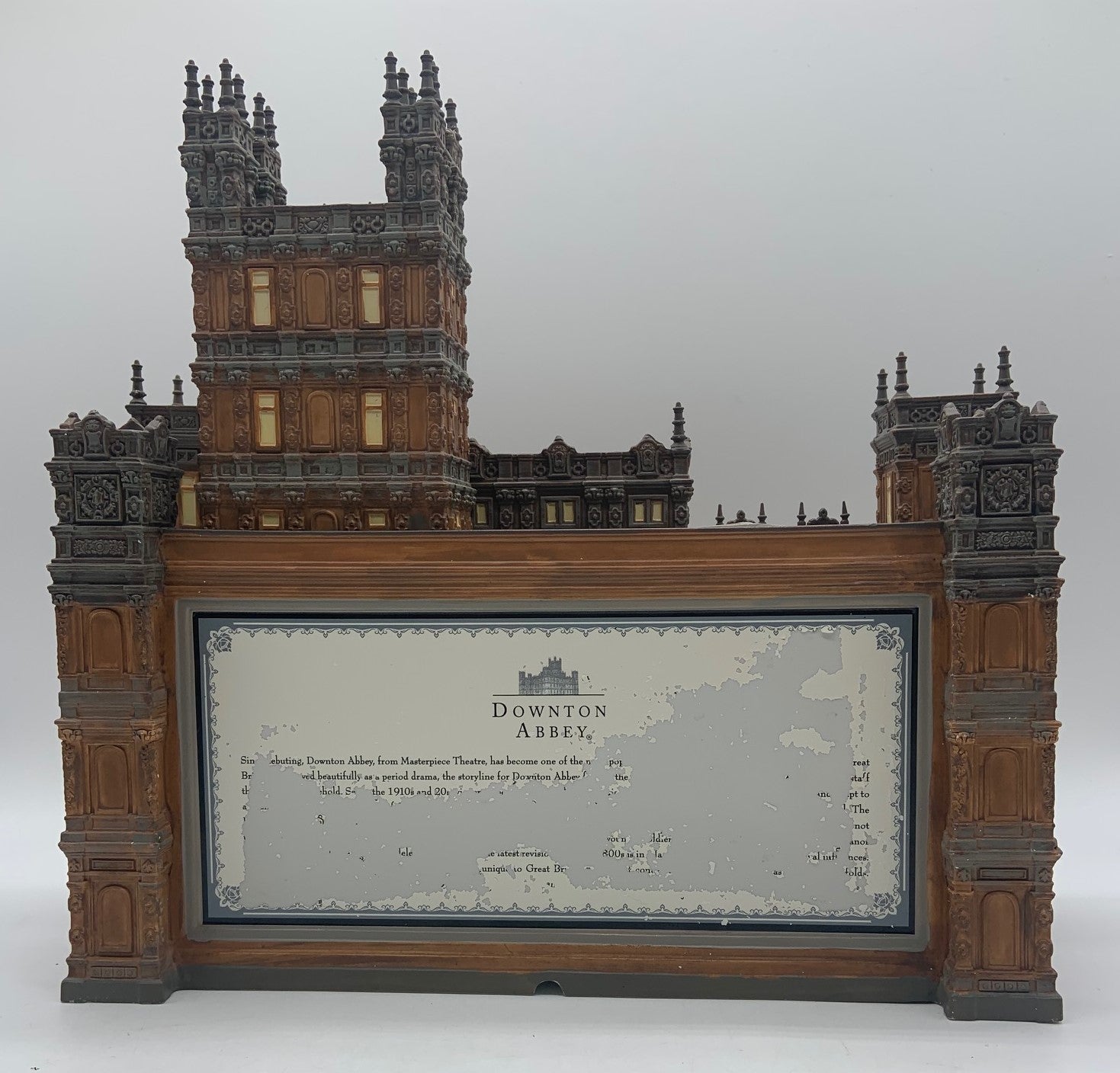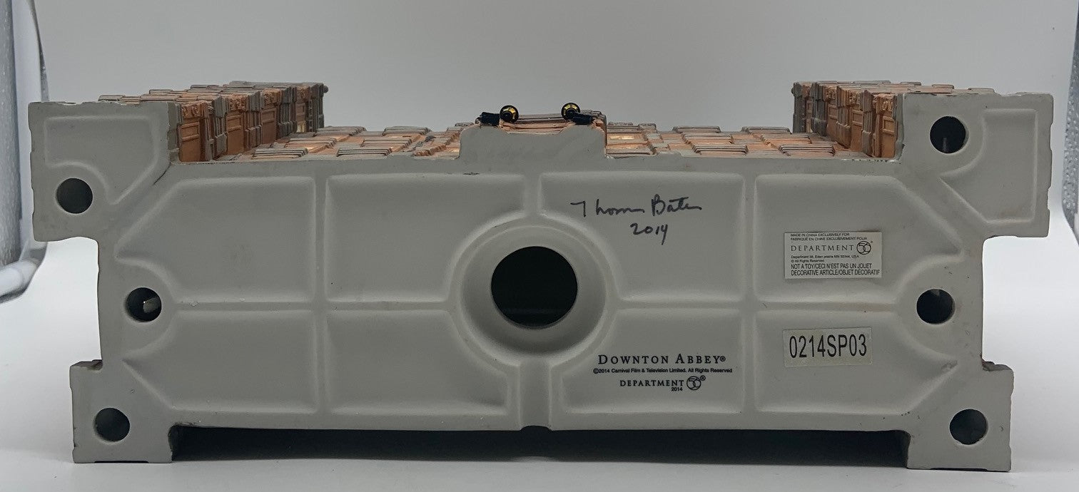 Released in 2014. Department 56 Downton Abbey Castle. Item #4036506 . Retired in 2015. See photos for item condition. Note: no box. front door has been repainted, missing several spires and/or repaired, back writing is missing. Signed by artist.
