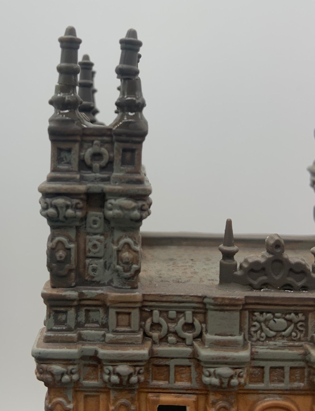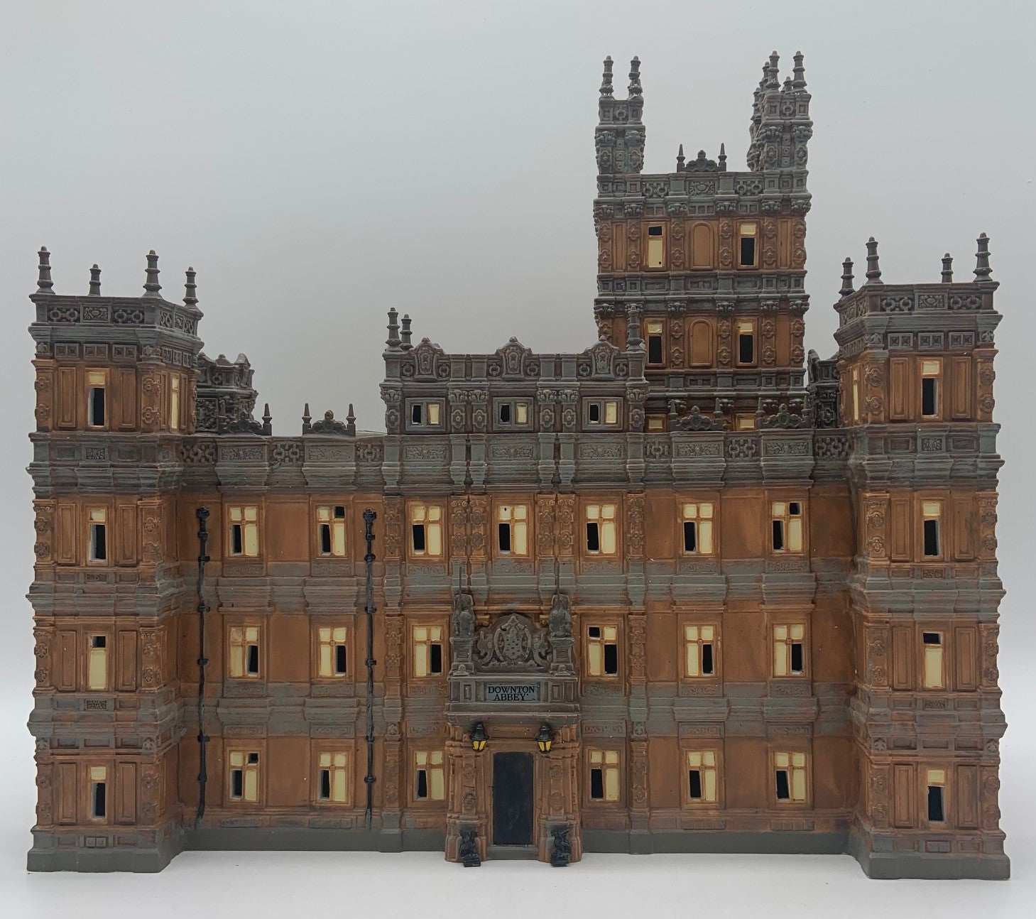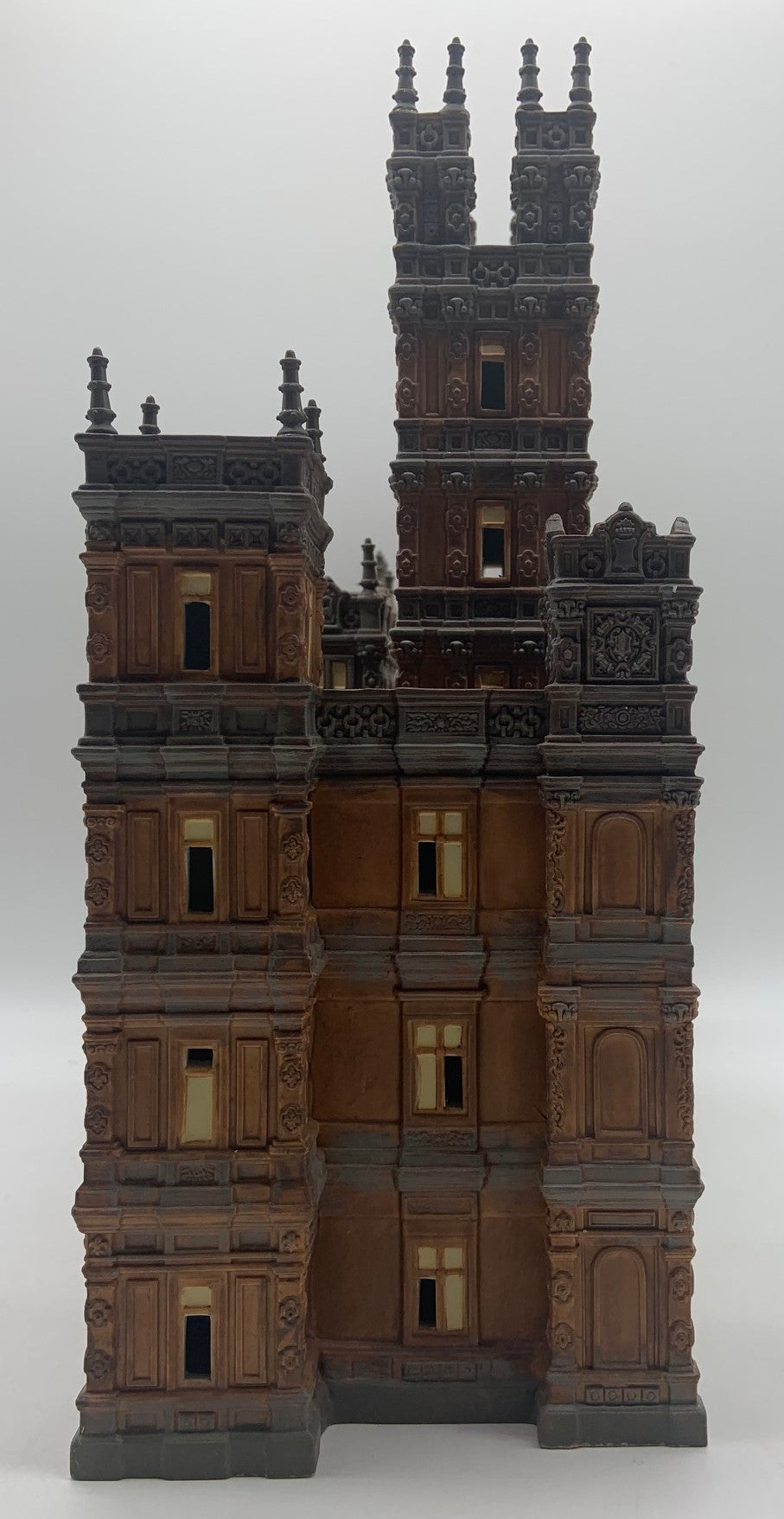 Released in 2014. Department 56 Downton Abbey Castle. Item #4036506 . Retired in 2015. See photos for item condition. Note: no box. front door has been repainted, missing several spires and/or repaired, back writing is missing. Signed by artist.