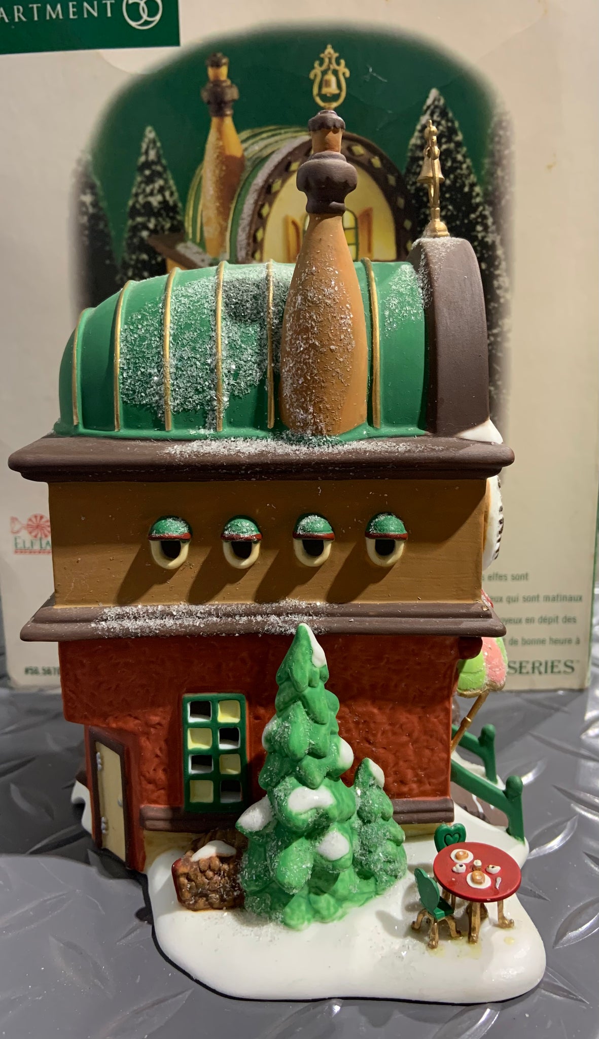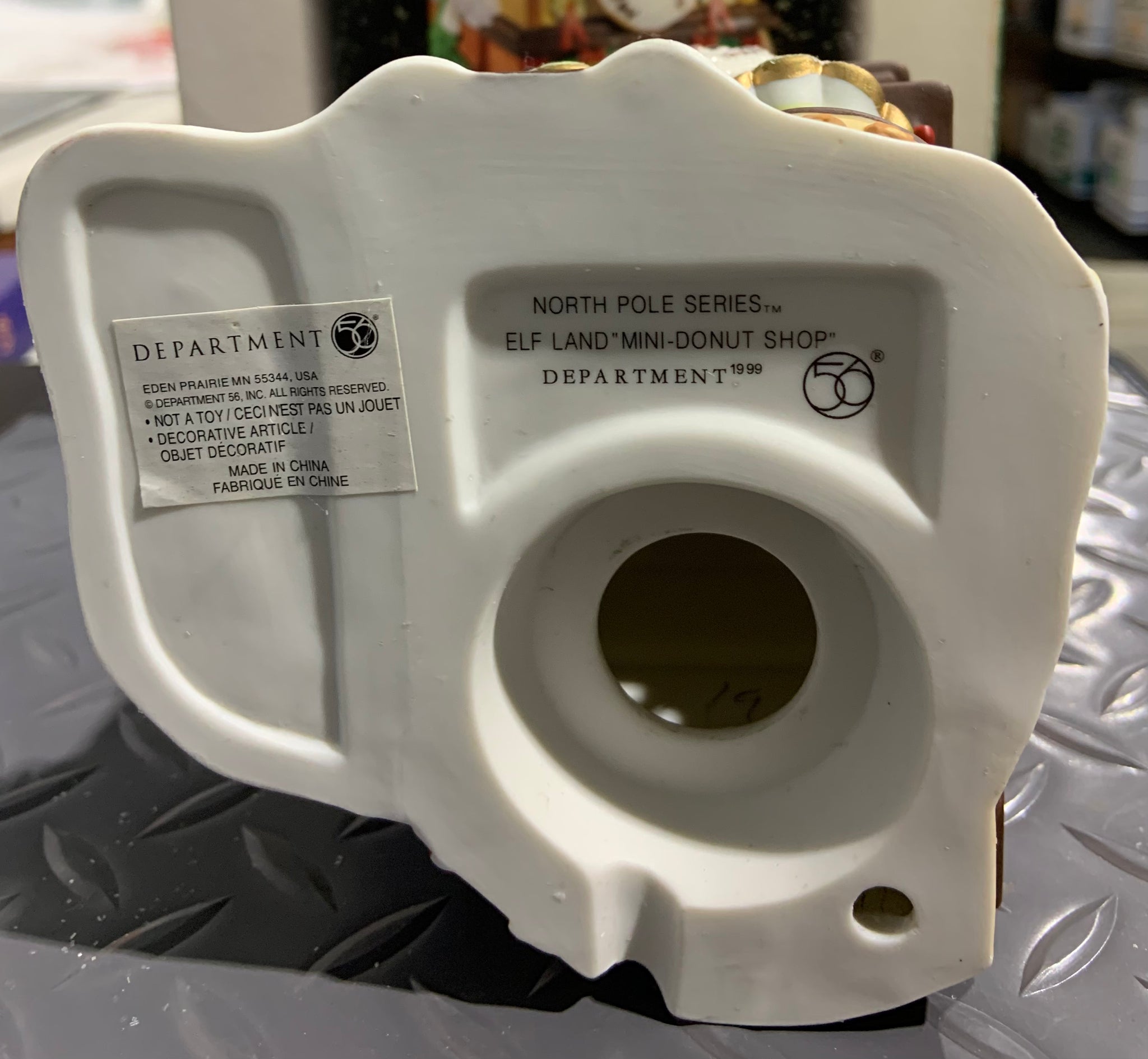 Released in 1999. North Pole "Mini-Donut Shop" Item # 56702. RETIRED in 2001. This building is part of the Elf Land subseries. Please see pictures for item and box condition details. Condition is "used" Note: umbrella is missing.