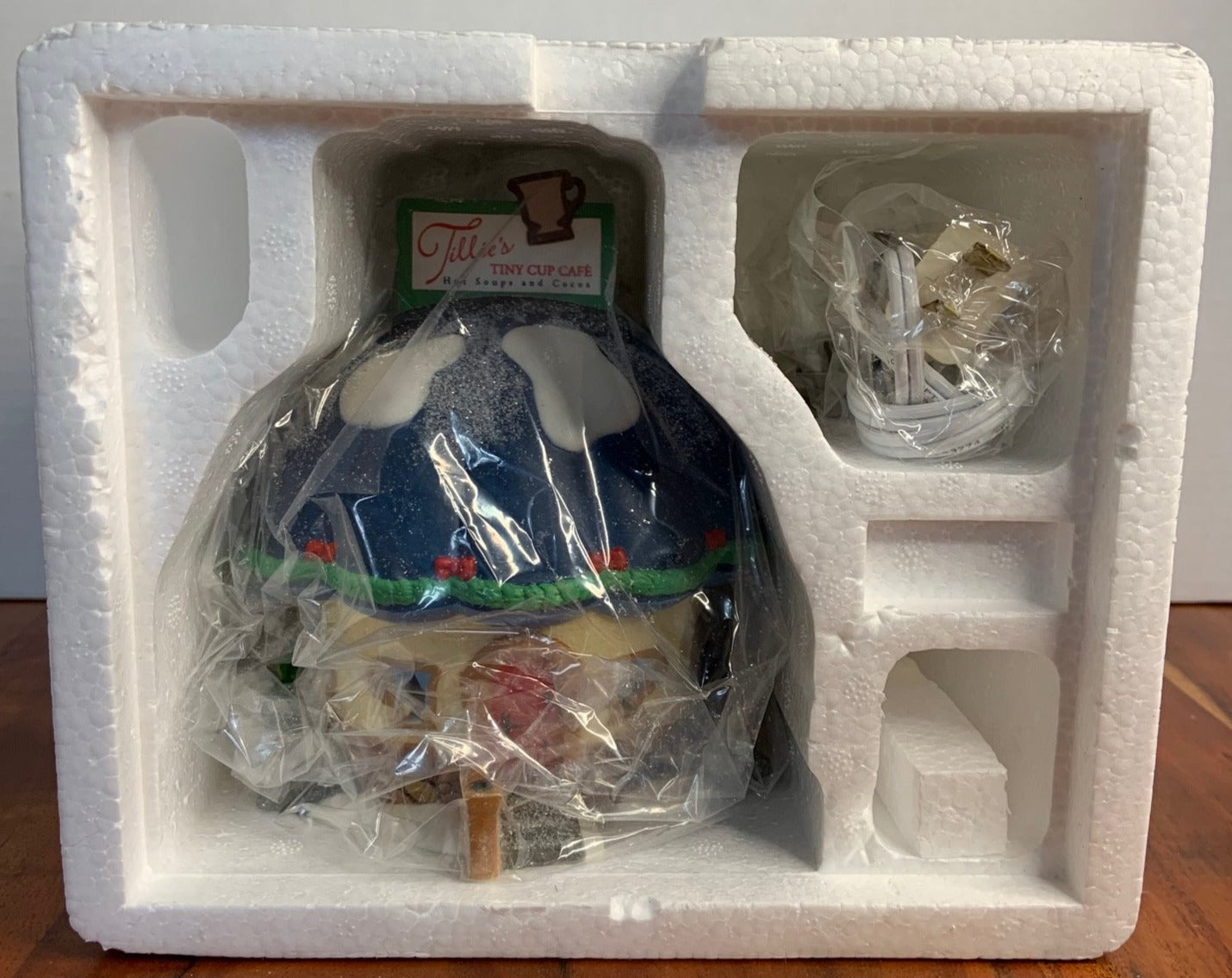 Released in 1998.  North Pole Village "Tillie's Tiny Cup Café" is part of the Elf Land subseries.  RETIRED in 2000. Please see pictures for item and box condition details. Condition is "Used"  Note: bell on front stairs has been replaced with a flag.
