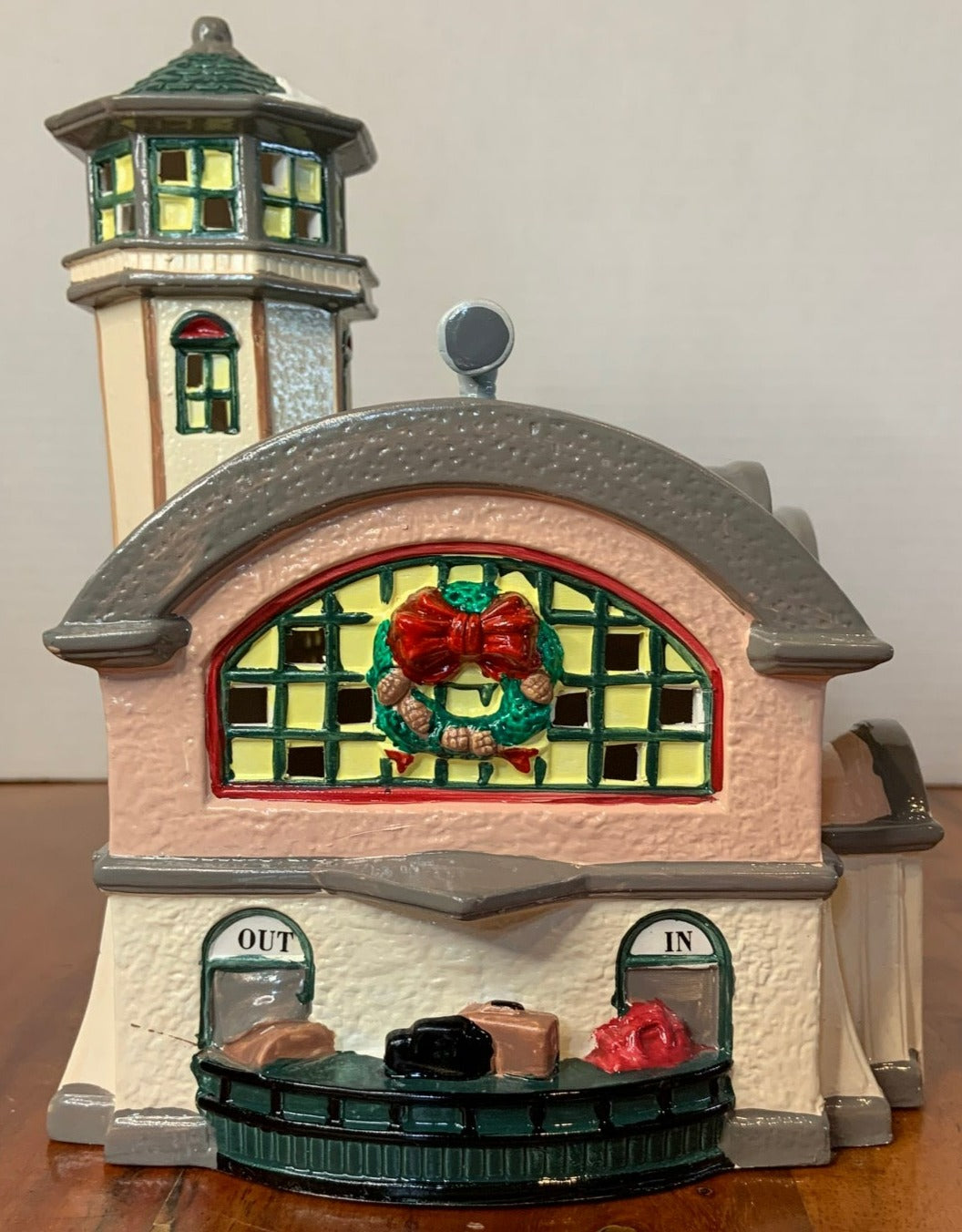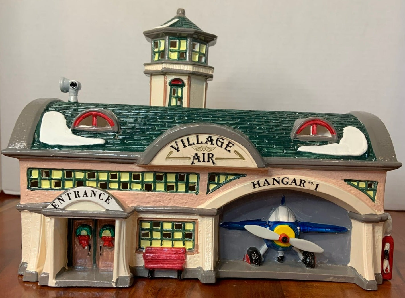 Released in 1992.  Snow Village "Airport" is a hangar with barrel-vaulted ceiling and attached control tower.  Design features include blue single-engine plane in hangar.  Includes red flag for tower.  Item #54399.  Retired in 1996.  See photos for item and box condition.