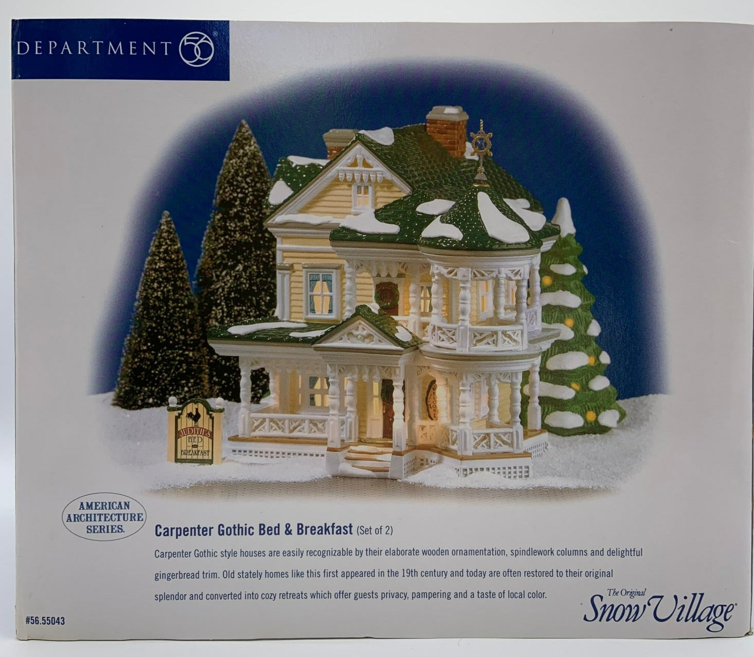 Released in 2000. Snow Village "Carpenter Gothic Bed & Breakfast" is the 11th building in the American Architecture Series. Ornately crafted 19th Century 2-story home with wraparound porches. Item #55043. Retired in 2003. See photos for item and box condition. Item is "used". Note: box sleeve is torn.