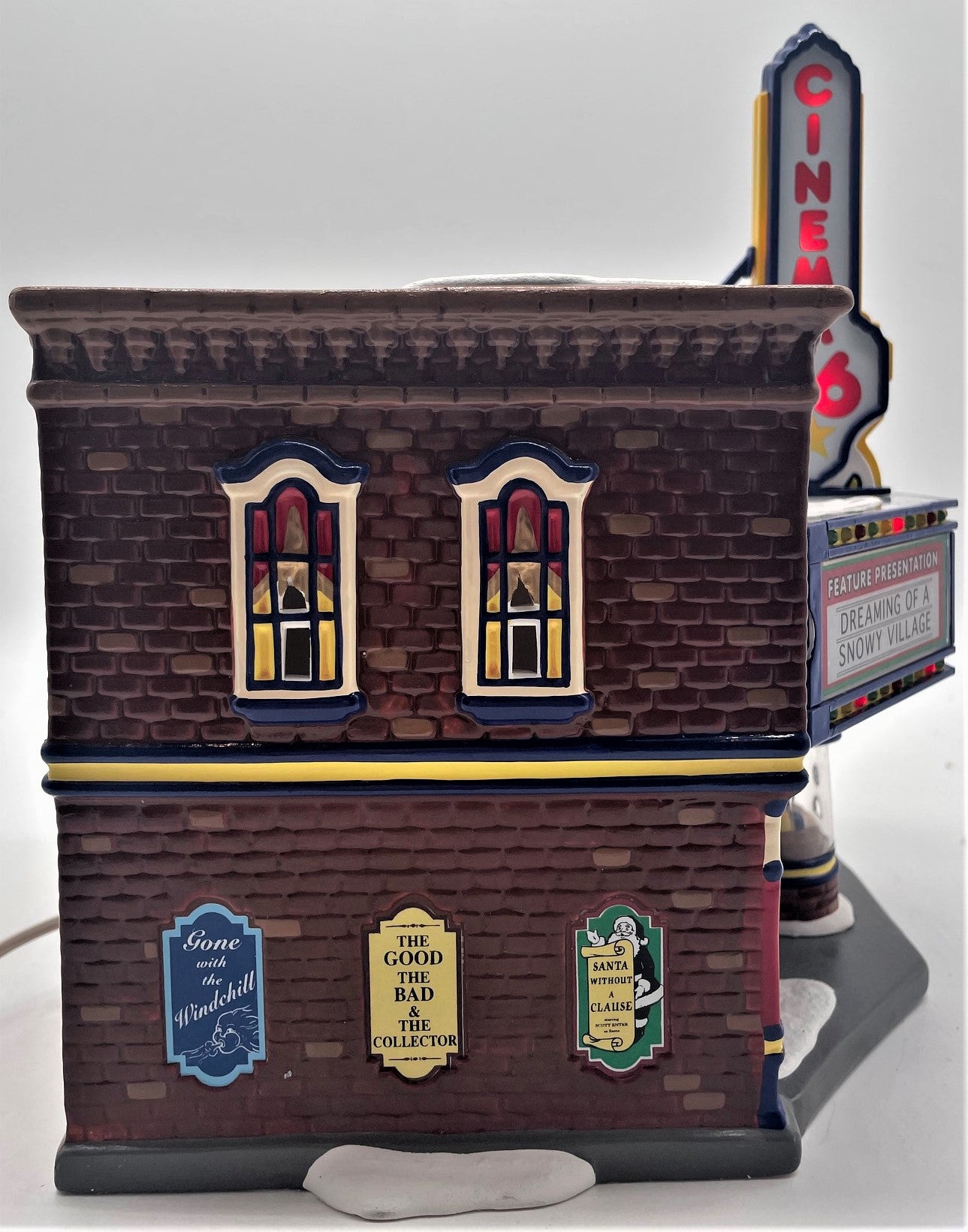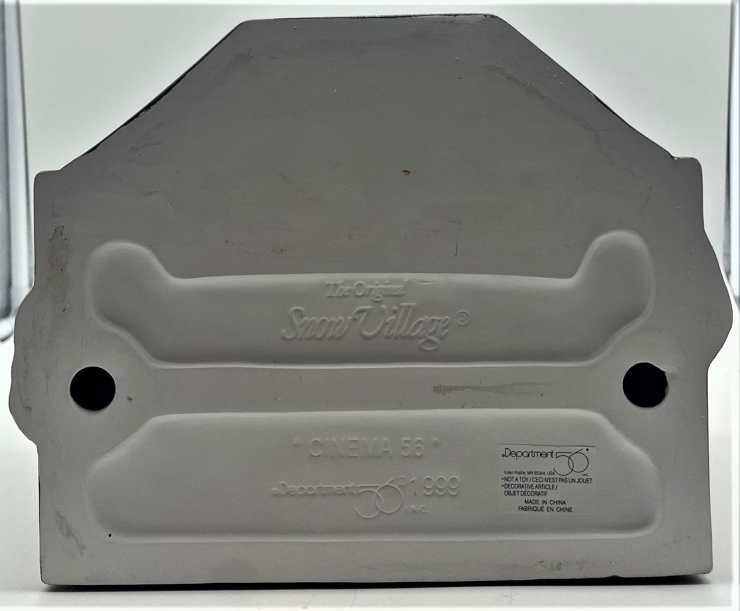 Released in 1999. Snow Village "Cinema 56" is a 2-story movie theater with 3-D ticket booth and LED lighted marquee. Item # 54978. Retired in 2001. See photos for item and box condition. Item is "used".