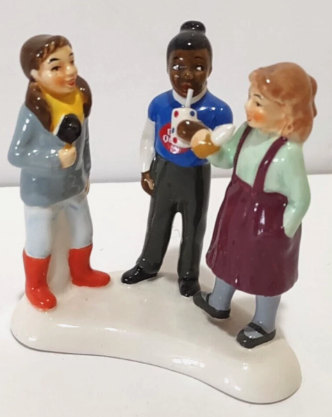 Released in 2015. Bring iconic Americana to your Department 56 Snow Village display with this charming DQ Cool Treats to Eat accessory. Coordinating accessory for "Dairy Queen Store". Item # 4044873. Retired in 2017. Note: not in original packaging. And one figurines' head has been repaired.
