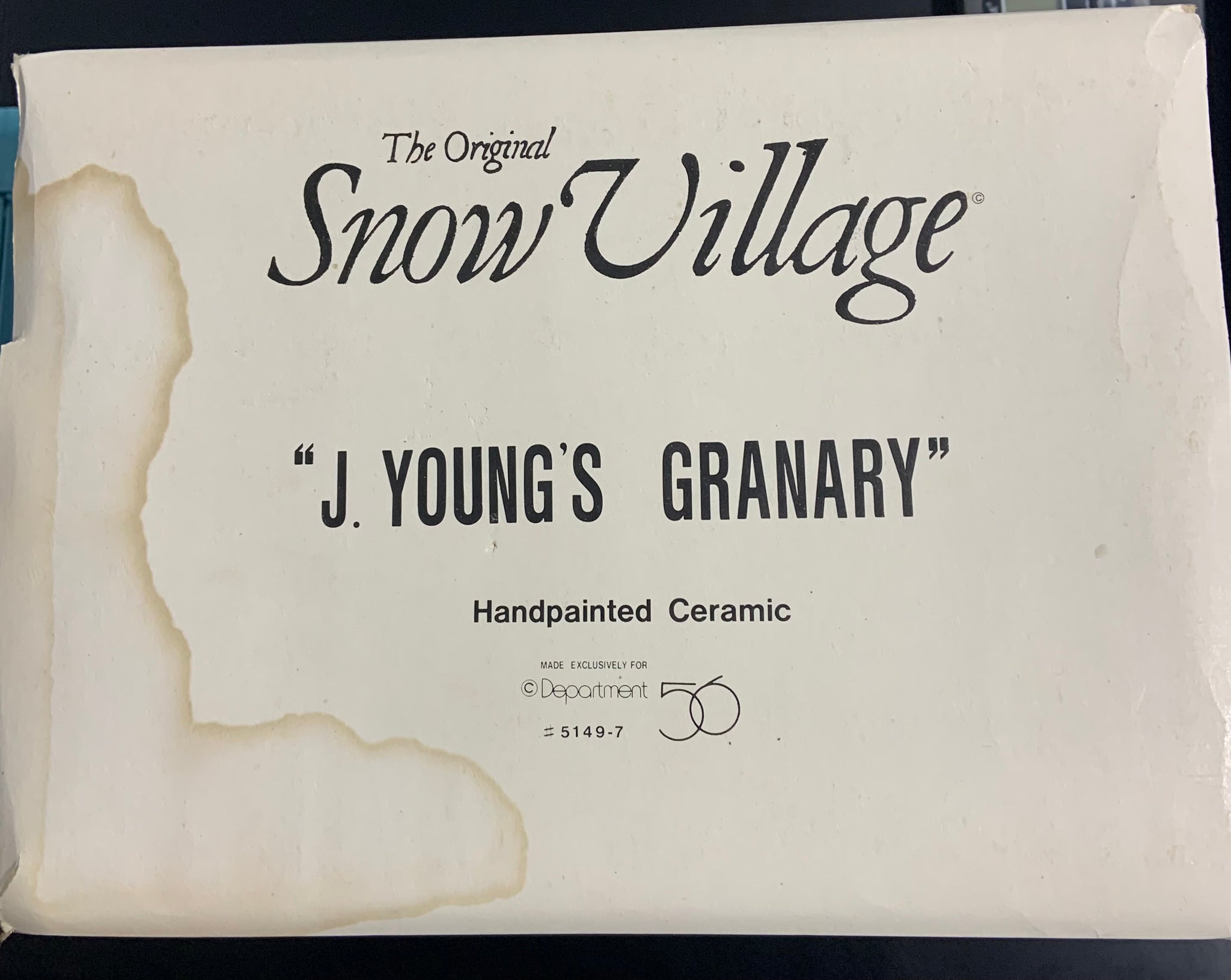 Released in 1989.  Snow Village "J Young's Granary" Item # 51497.  Retired in 1992.  Item is "used" see photos for item and box condition.  Noted: box sleeve has water stain.
