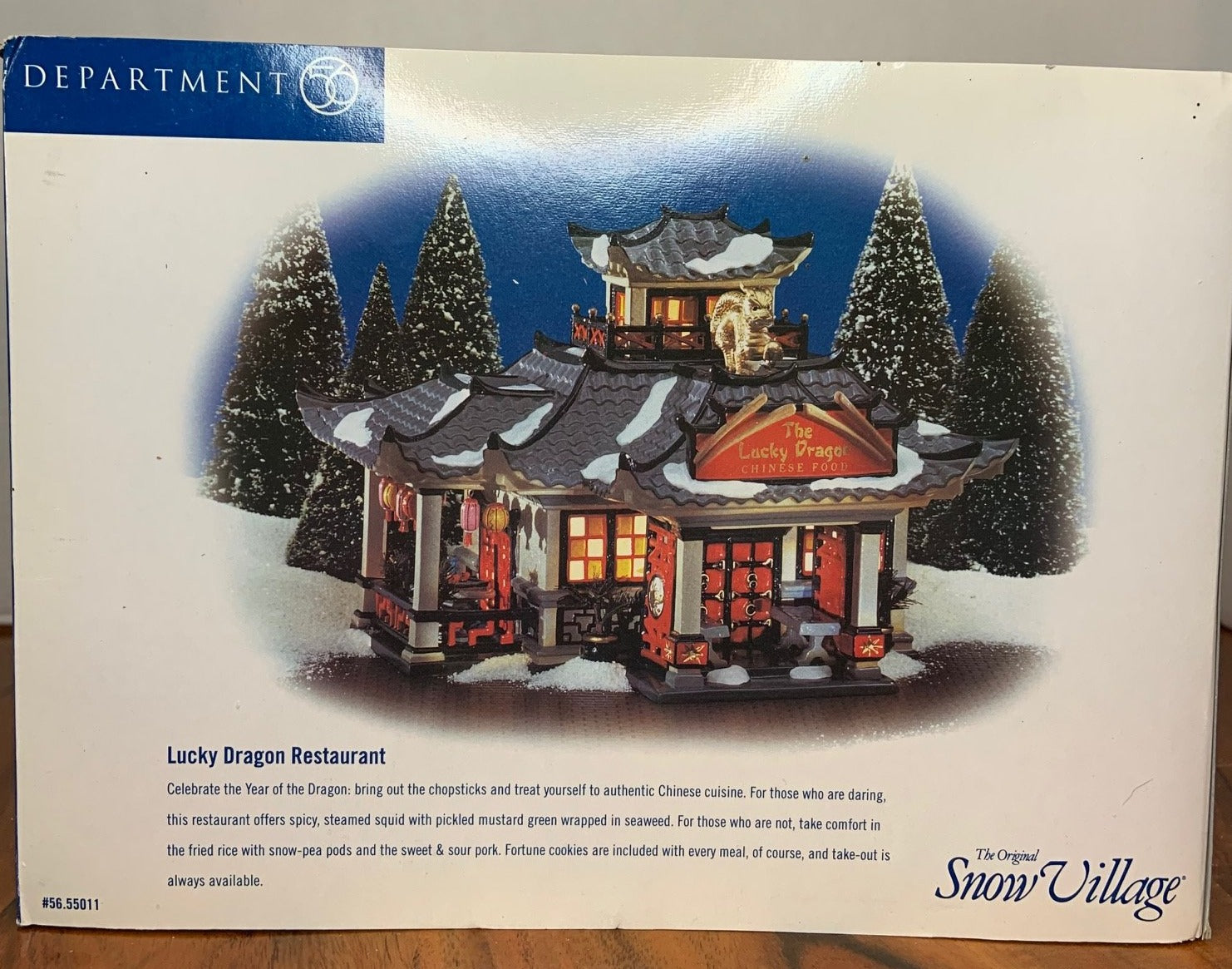 Released in 1999. Snow Village "Lucky Dragon Restaurant" is an intricately detailed Chinese restaurant with authentic coloring and features. Item # 55011. Retired in 2000.