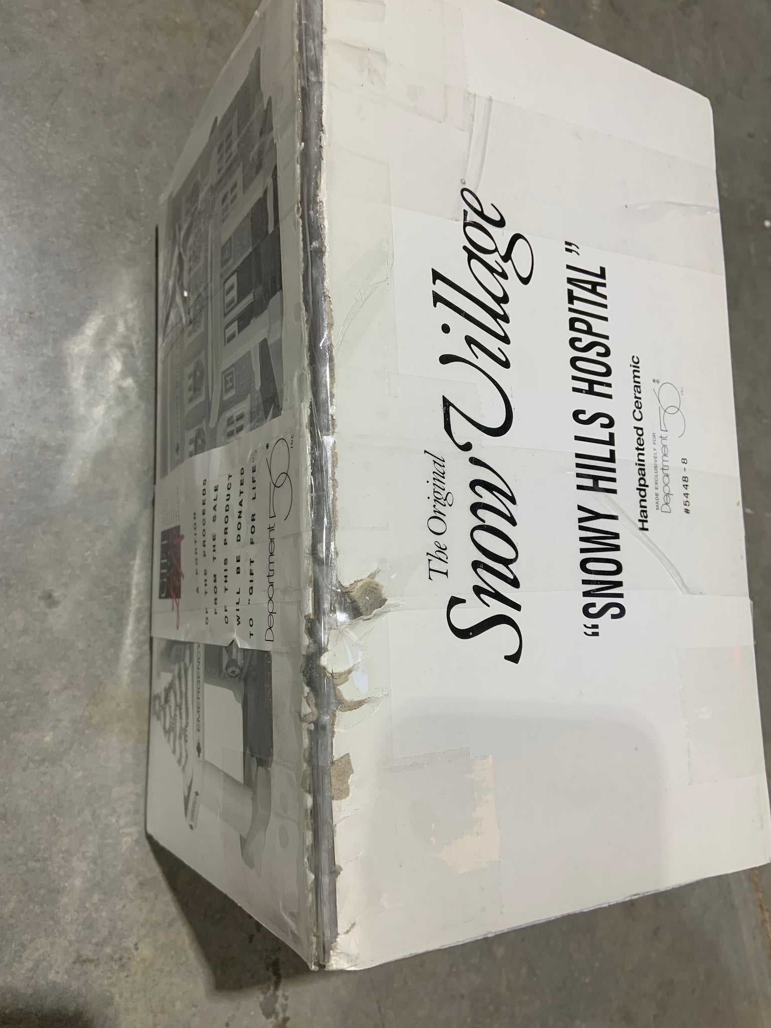 Snow Village "Snowy Hills Hospital" Released in 1993. 2-Story Hospital with covered front entrance and side portico for emergencies.  Item #54488. Retired in 1993. Item is "USED". See photos for item and box condition.  Note: box sleeve is damaged.