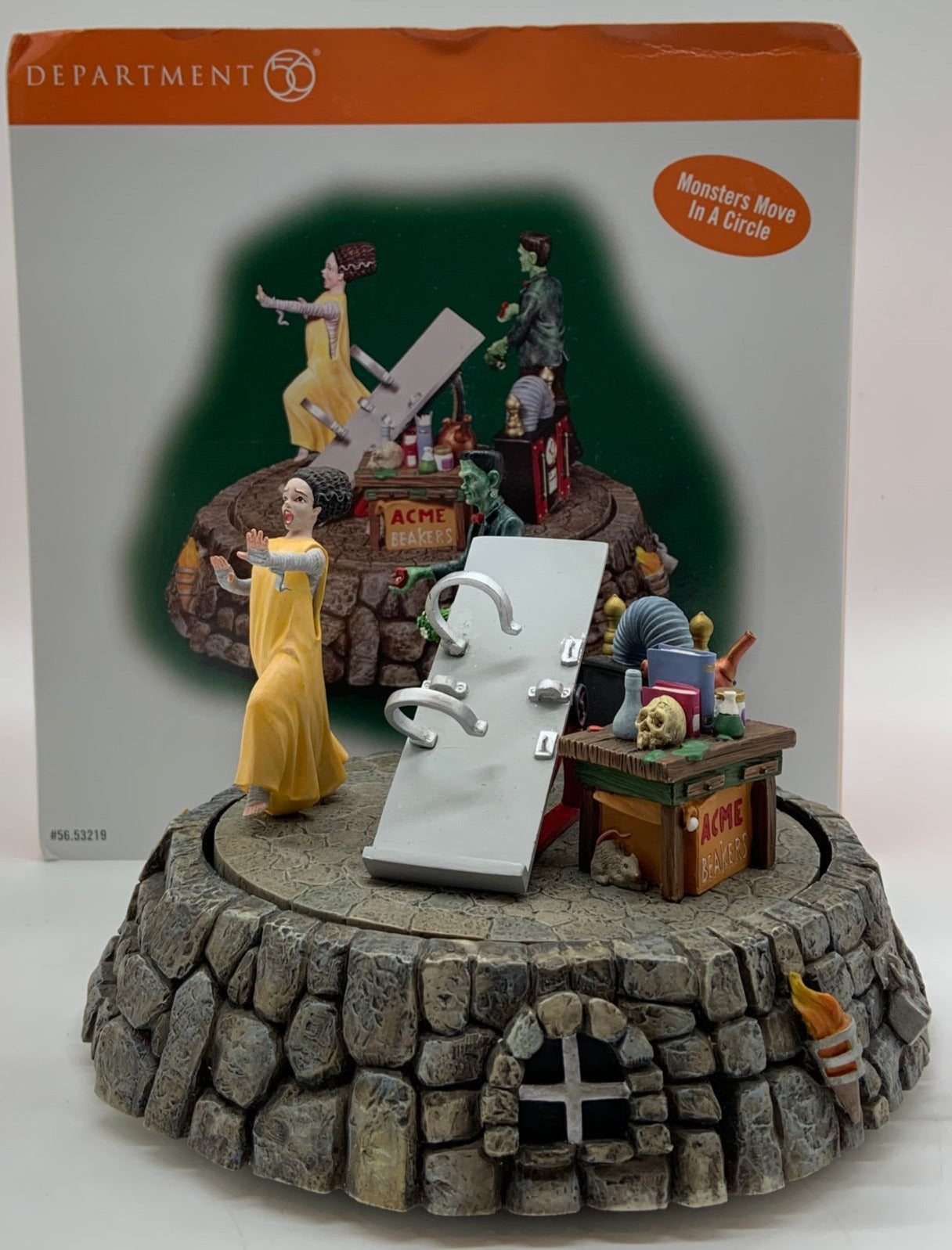 Released in 2005. Bring your Halloween village to life with this delightful Department 56- Snow Village Halloween "Runaway Monster & Bride" accessory. Expertly crafted and detailed, this animated piece adds a spooky touch to any display. Item # 53219. Retired in 2007.