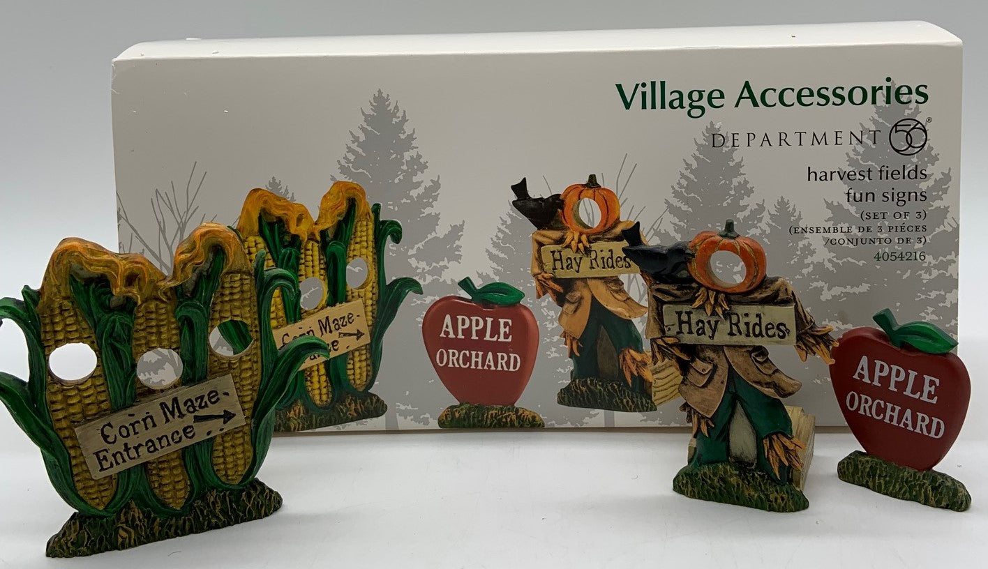 Released in 2016. Bring the charm of the countryside to your village with Department 56 "Harvest Fields Fun Signs" accessory. These set f 3 delightful signs feature bright, playful designs that will bring a smile to your face. Item # 4054216.