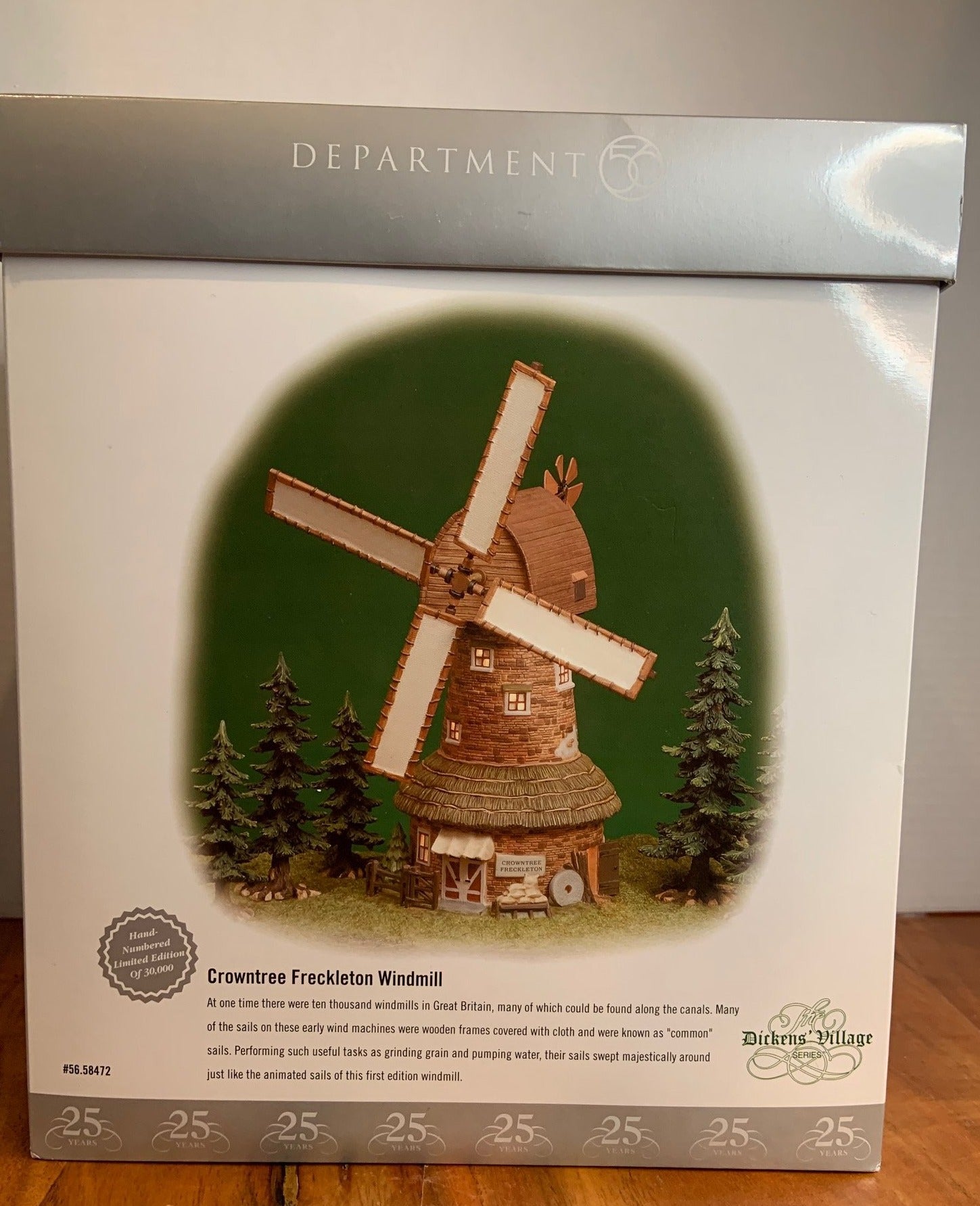 Released in 2000. Dickens' Village "Crowntree Freckleton Windmill" is part of the Abington Canal subseries. This is a hand-numbered piece of 30,000 total pieces produced. The windmill rotates and works great. Item #58472. RETIRED in 2001. Please see pictures for item and box condition details. Condition is "Used"