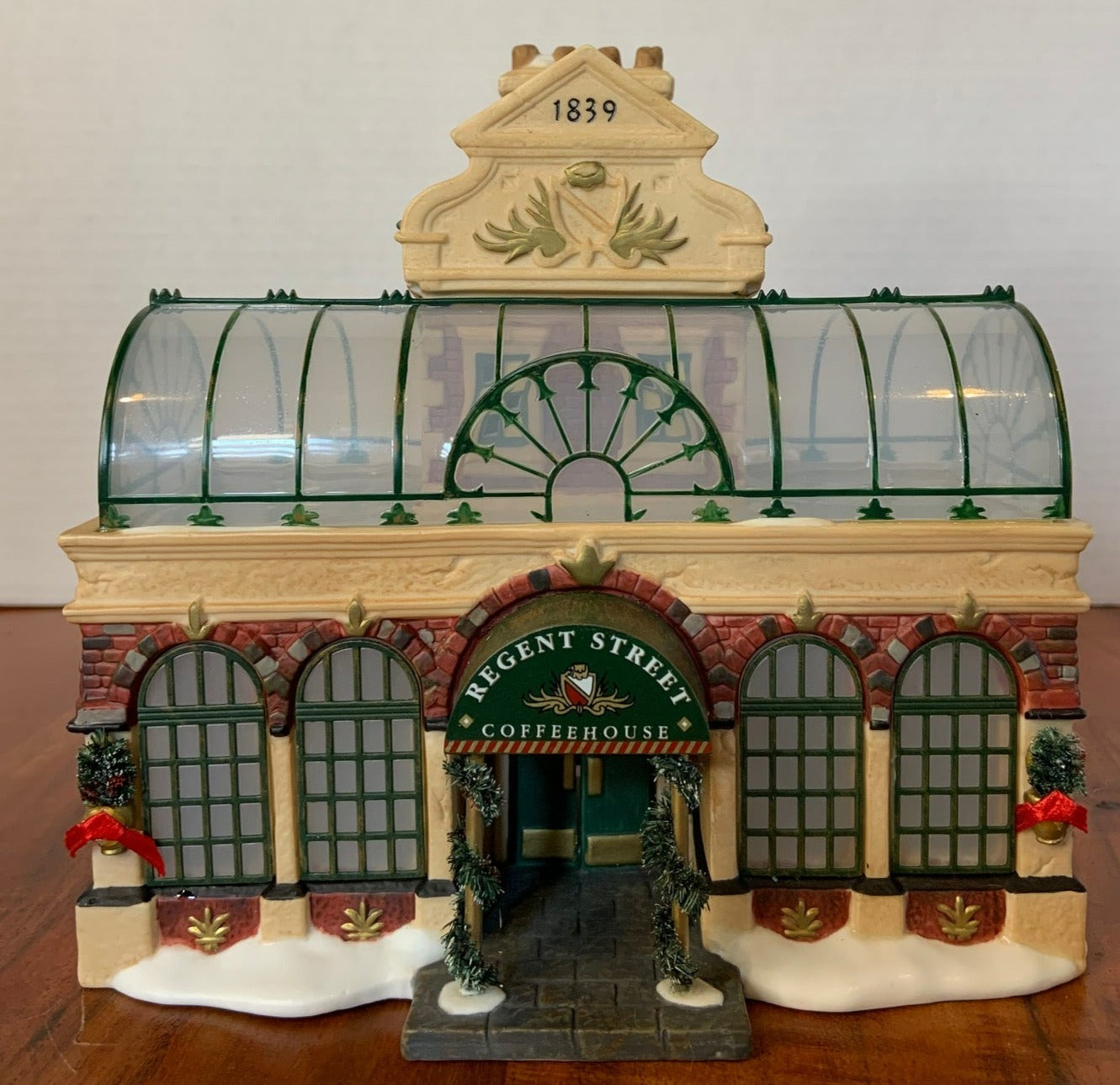 Released in 2002.  Dickens' Village "Regent Street Coffeehouse" is a brick building with frosted arched roof and windows.  Regent Street is a major shopping area in the West End of London.  Item #58507.  Retired in 2004. Item is "used".
