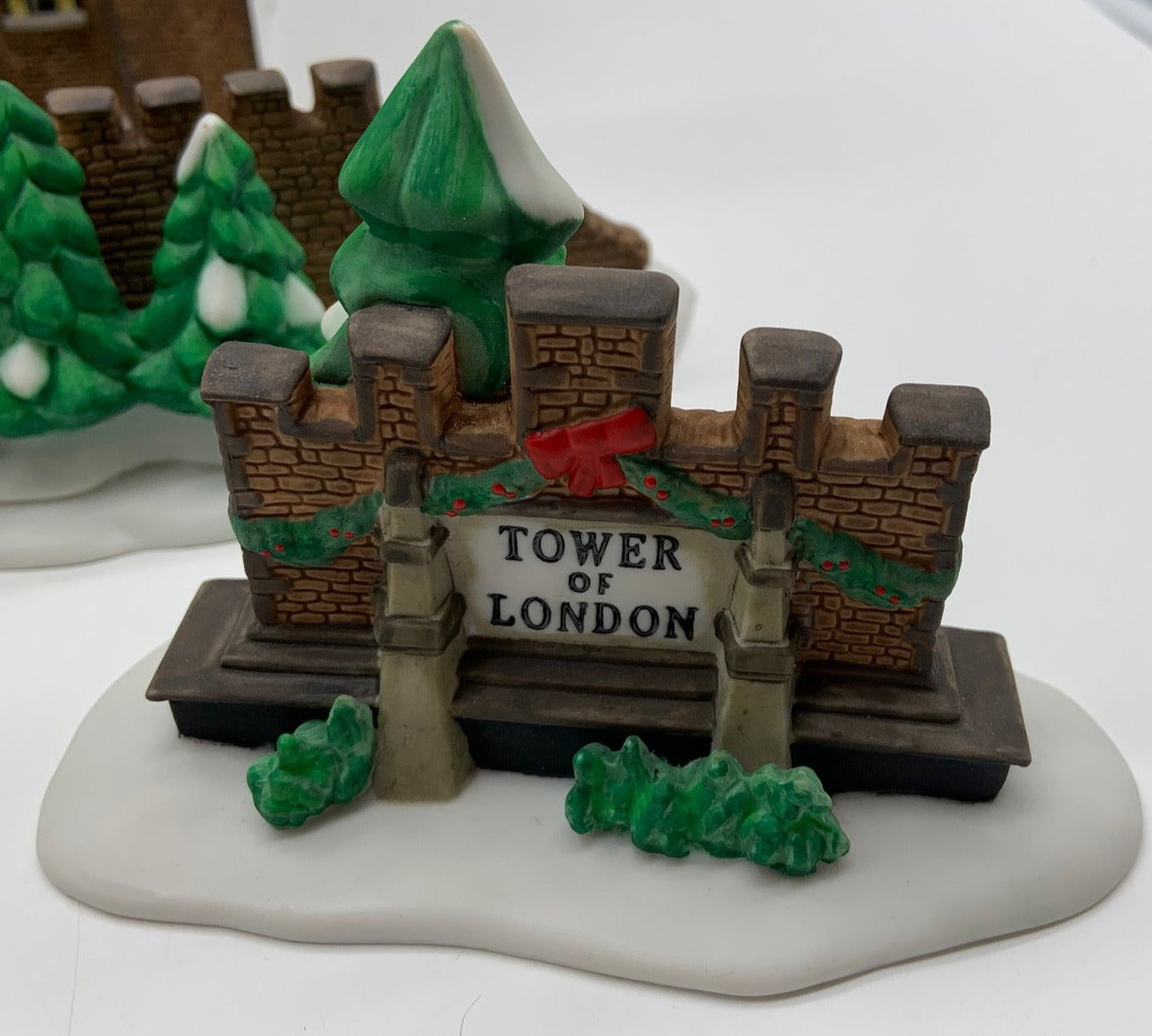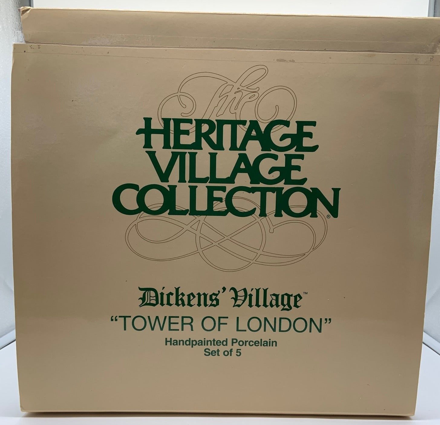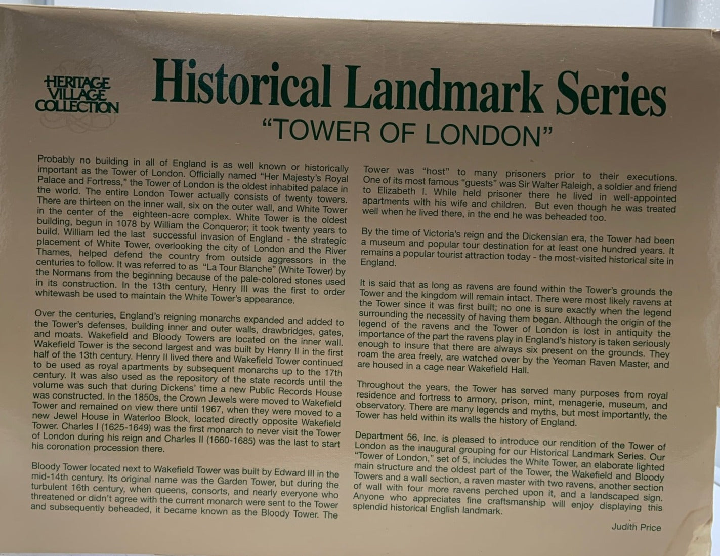 Released in 1997, the Department 56- Dickens' Village Tower of London is the first Historical Landmark design and provides a genuine and realistic representation of the White Tower, one of the 20 that make up the historical site. Its minute details and intricate design bring the story of London’s famous landmark to life.  Set of 5 includes the tower, a gate with tower, the raven master, a sign and a wall with ravens.  Retired in 1997.  Item # 58500.  See photos for item and box condition.  Item is "used".