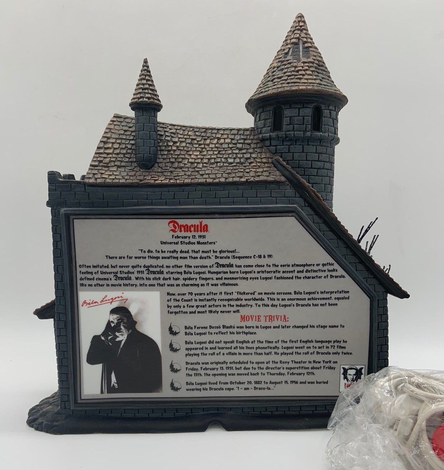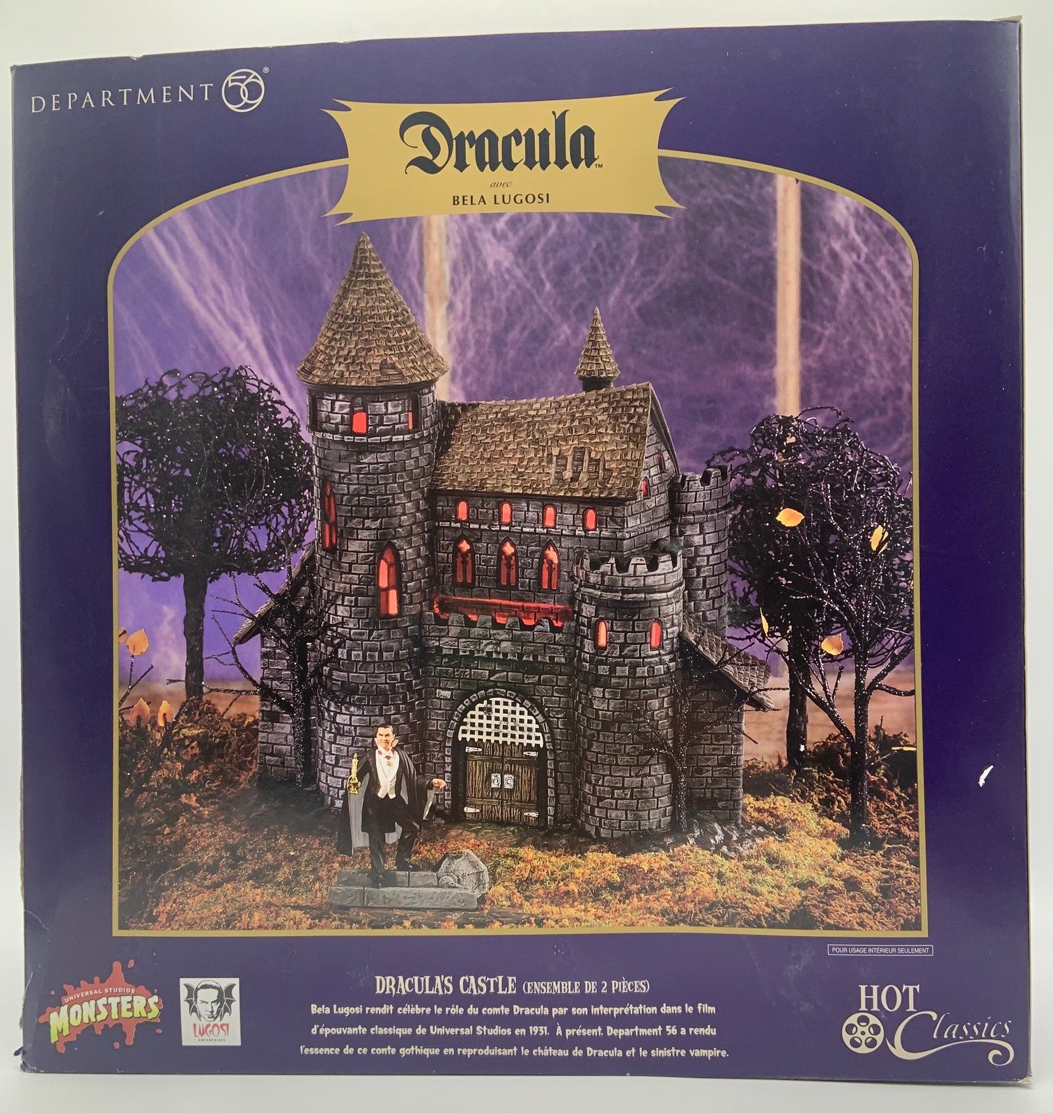 Released in 2002.  Bring a haunting touch to your holiday village with the Department 56 Hot Properties "Dracula's Castle" set of 2.  Dark and frightful black castle that is easily and often incorporated into Original Snow Village Halloween displays.  Accessory: "Count Dracula".  Item # 59301.  Retired in 2005.  See photos for item and box condition.  Item is "used".