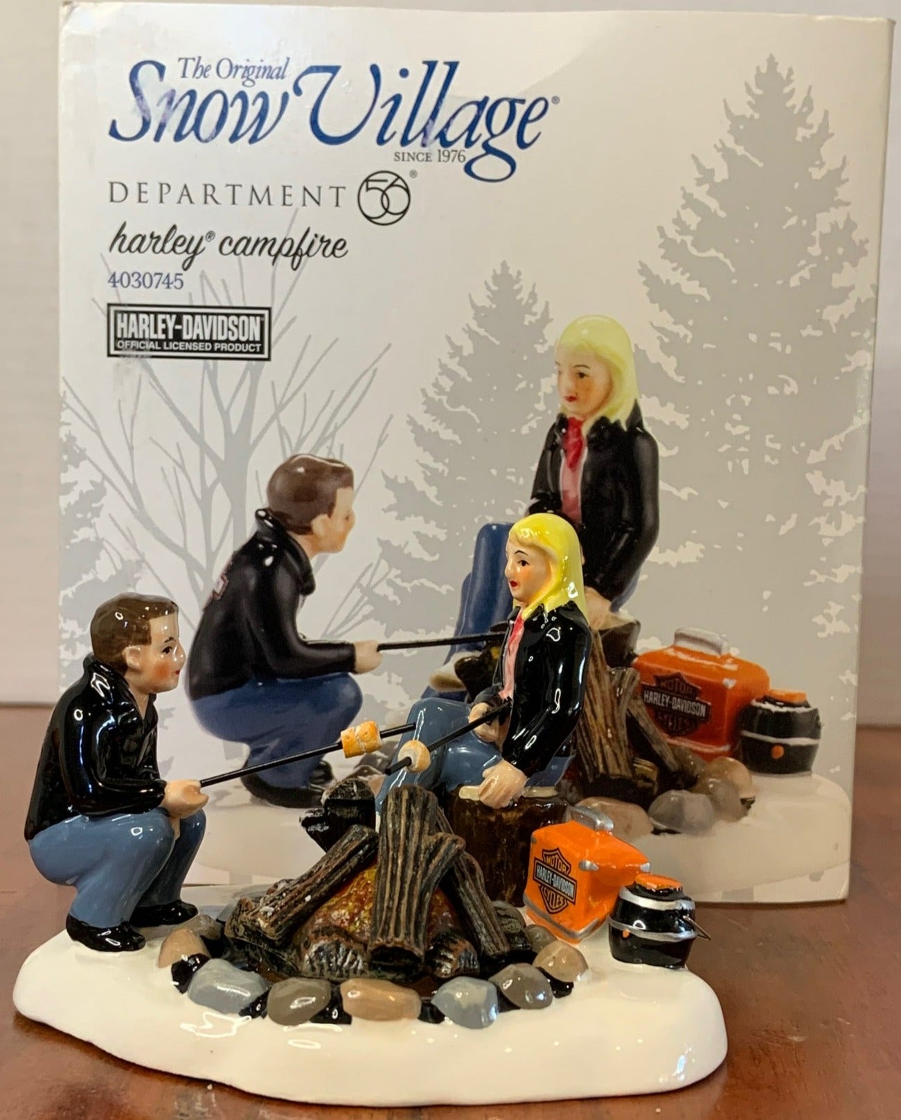 Released in 2013. Snow Village "Harley Campfire" Harley-Davidson is the coordinating accessory for "Harley Roadside Cabins" and "Harley Roadside Motel". Item # 4030745. Retired in 2016.