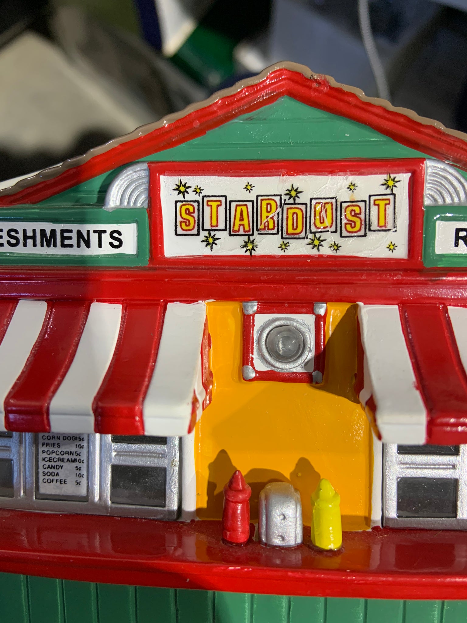 Released in 2001. now Village "Stardust Refreshment Stand" set of 7 includes stand and 6 freestanding double car speakers. Companion for "Stardust Drive-In Theater". Item # 55065. Retired in 2003. See photos for item and box condition. Item is "used". note: front sign has been repaired.