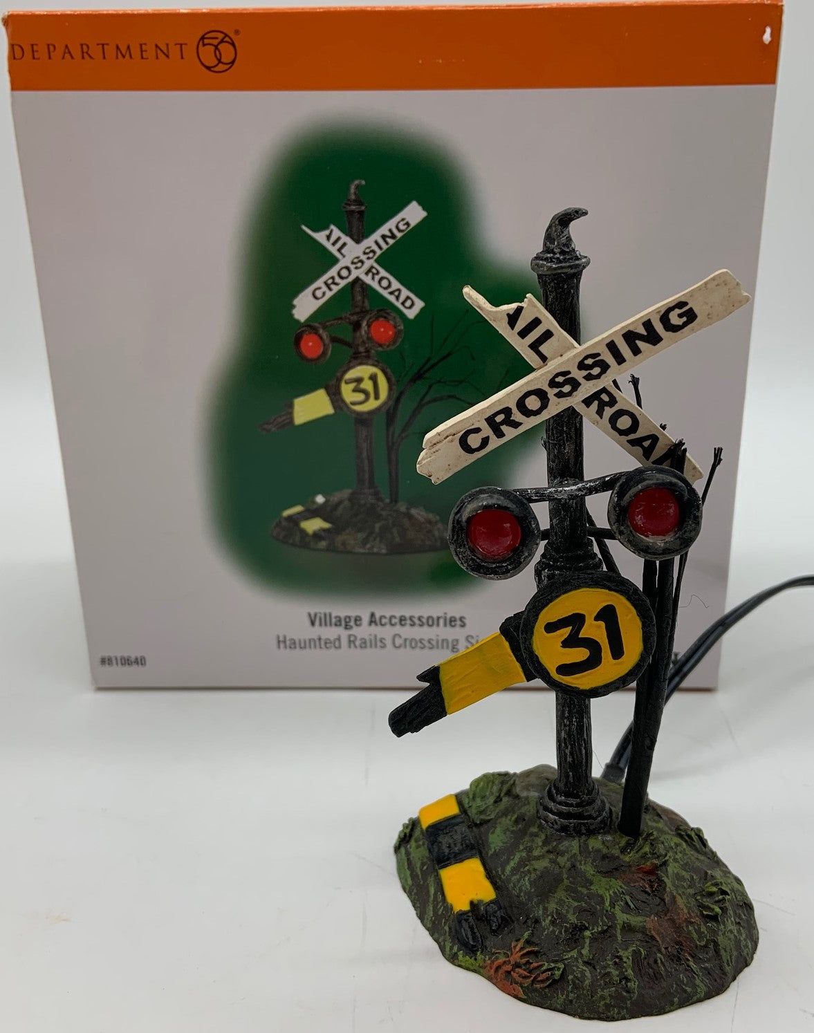 Released in 2008. The Department 56- Snow Village Halloween "Haunted Rails Crossings LED sign" accessory is an must have for your Haunted Rails subseries. Lighted, battery and AC/DC lighting system compatible. Retired in 2014. Item # 810640.
